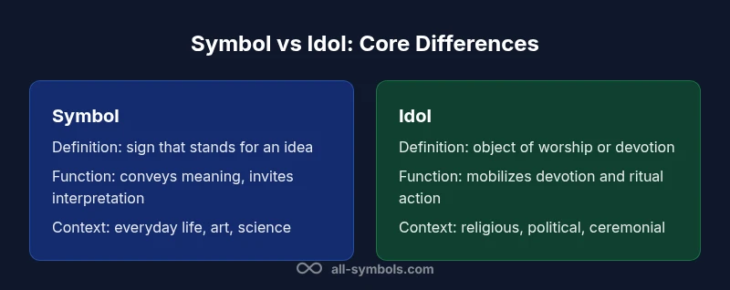 A symbol is a sign that conveys abstract meaning within a culture, while an idol is an object of worship or devotion with ritual significance. Symbols communicate ideas; idols evoke reverence and action.
