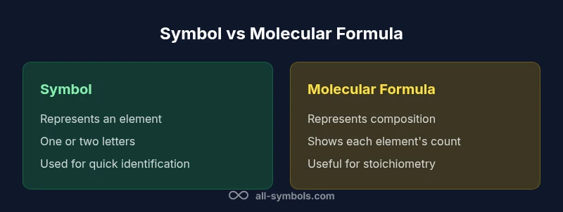 Symbol vs molecular formula: a chemical symbol names an element and is usually one or two letters (H, He, Na) used for quick identification. A molecular formula provides the exact composition of a molecule, listing how many atoms of each element are present (H2O, CO2). The difference between symbol and molecular formula lies in scope: symbol points to an element, formulas specify composition and stoichiometry.