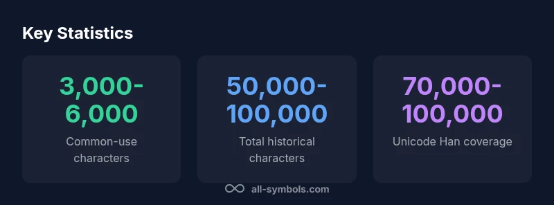No single fixed number exists for Chinese symbols. In daily literacy, about 3,000–6,000 characters are commonly used; dictionaries and scholars estimate tens of thousands of historically attested characters. Unicode and reference works broaden the count, but the exact total depends on counting criteria. For digital design and language learning, knowing the distinction between common-use characters and rarer forms is essential.