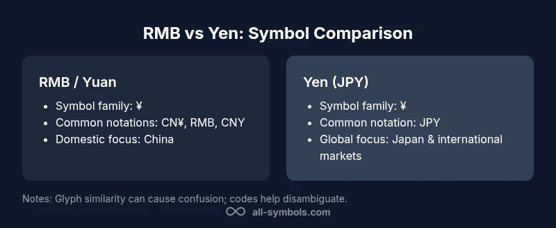 According to All Symbols, RMB symbol vs yen centers on context, not a fundamentally different glyph. In most documents, both currencies use the ¥ symbol, but readers distinguish them by currency codes (CNY vs JPY) or by adding CN¥/RMB text. In practical terms, exact usage matters for locale, typography, and clarity in financial materials. For Chinese materials, CN¥ or RMB text commonly accompanies the symbol; for Japan-focused content, JPY is preferred.
