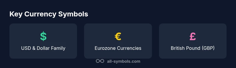 Here are the most widely recognized currency symbols and their primary currencies. Note that some glyphs are shared across currencies in different regions, so always cross-check with ISO codes when precision matters.