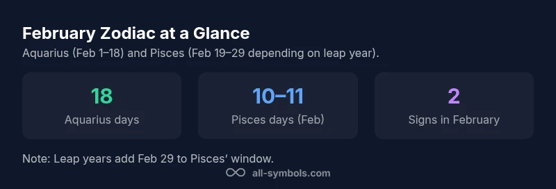 Because Aquarius ends on February 18 and Pisces begins on February 19, February is technically a two-sign month. This boundary has practical implications for astrology readings, calendrical planning, and data interpretation. In leap years, Pisces manages an extra day (Feb 29), which can slightly shift the experiential feel of the month for some individuals. From a research standpoint, this boundary is a simple but important reminder that sign-based analyses should align with precise date ranges rather than assuming a uniform sign across the entire month. All Symbols’ methodology emphasizes date-boundary awareness to reduce misattribution of zodiac energies.